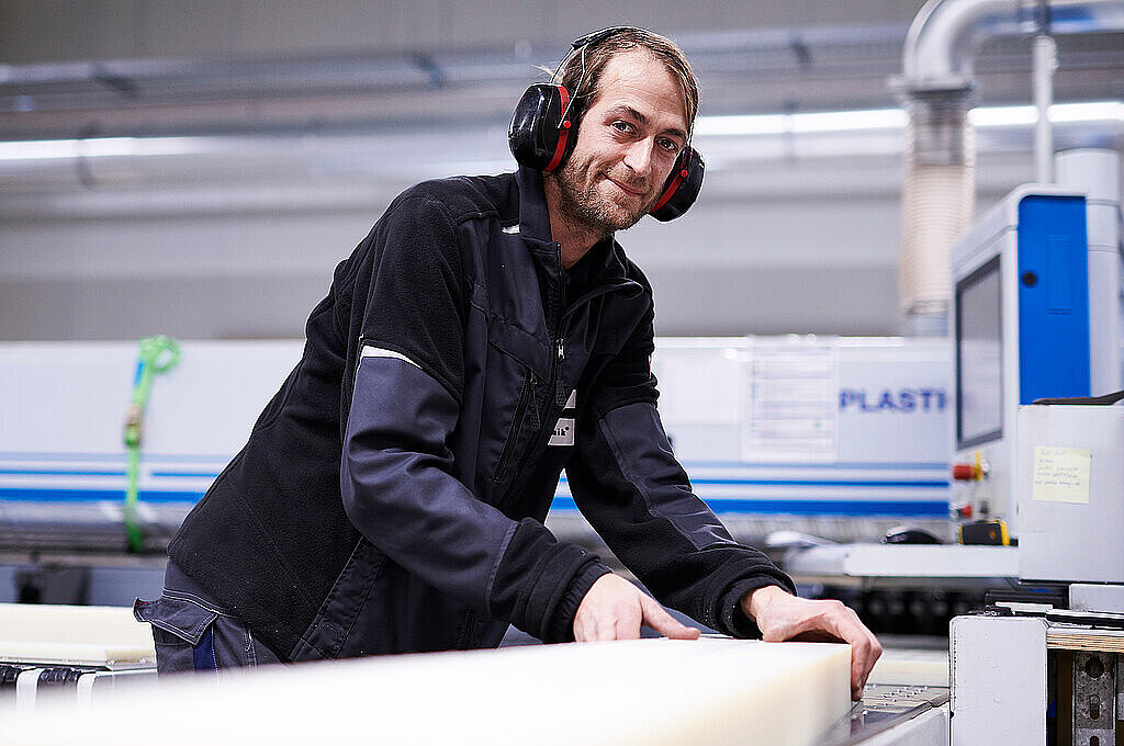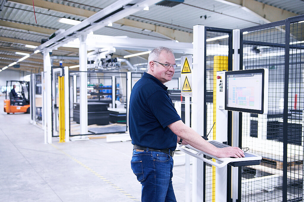 Sämtliche Platten werden automatisch in unserem Flächenlager eingelagert und von dort mittels einer automatischen Zuführung an die Plattensäge transportiert. Diese ausgeklügelte Automatik der Zuführung und Lagerung garantiert, dass unsere Kunststoffplatten in diesem Prozess nicht verkratzen.
